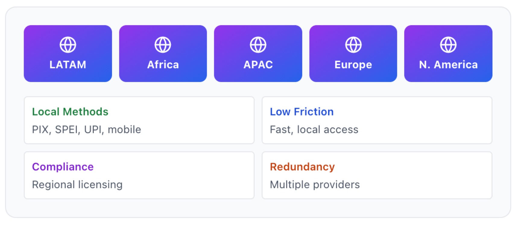 - Local payment methods: PIX in Brazil, SPEI in Mexico, UPI‑like rails in India, mobile money in Africa, and regional bank transfers